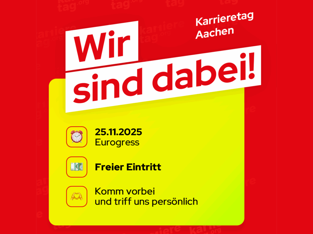 Treffen Sie uns am 25.11.2025 zwischen 10.00 Uhr und 17.00 Uhr auf dem Karrieretag im Eurogress in Aachen. Wir informieren über unsere Stellenangebote. Unser Team steht für alle Infos rund um unsere offenen Stellen bereit. Infos und Tickets unter www.karrieretag.org